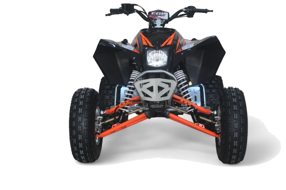 gwarantują pewność prowadzenia i bezpieczeństwo nawet na trudnych nawierzchniach. Stabilne zawieszenie wspiera masywną konstrukcję, pozwalając na komfortowe pokonywanie nierówności i przeszkód. Mad Max 250 nie boi się żadnego terenu.